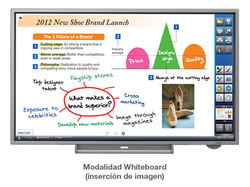 El Software Sharp Pen® permite dos modalidades de trabajo. Con la forma de trabajo Whiteboard permite trabajar con imágenes (JPGE, BMP,TIFF) de una carpeta de trabajo o pueden ser incorporadas al software por medio del escanner de un multifuncional SHARP® (periférico adicional) y ser visualizadas en la pantalla para poder escribir y dibujar rápidamente sobre ellas con el lápiz (incluido en cualquier modelo de Aquos Board®) o con el dedo. Con este software se puede incorporar la cantidad de láminas que el proyecto requiera. Una vez concluida la sesión de trabajo, el Aquos Board® puede almacenar el archivo creado (se requiere una PC), mandar la información vía correo electrónico (se requiere conexión a internet) o ser impresa en un multifucncional SHARP® (periférico adicional). También la modalidad de Whiteboard cuenta con 7 plantillas prediseñadas (plan de acción, lista de tareas, calendario, planificación mensual, actas, pizarrón verde y corcho) que agilizan las sesiones de trabajo o los usuarios pueden elaborar y cargar sus propias plantillas.